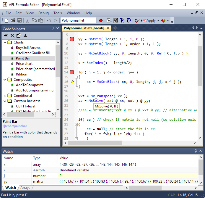 In AmiBroker Formula Language (AFL) vectors and matrices are native types like plain numbers. To calculate mid point of High and Low arrays element-by-element you just type MidPt = ( H + L )/2; // H and L are arrays and it gets compiled to vectorized machine code. No need to write loops. This makes it possible to run your formulas at the same speed as code written in assembler. Native fast matrix operators and functions make statistical calculations a breeze.