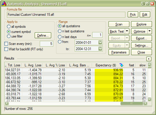 Let us start with this simple formulation. With this approach expectancy simply tells us expected profit per trade in dollars. The custom backtest formula that implements this user-defined metric looks as follows: