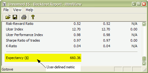 Now when you run Backtest and click Report button in Automatic Analysis window you will see your custom metric added at the bottom of statistics page:
