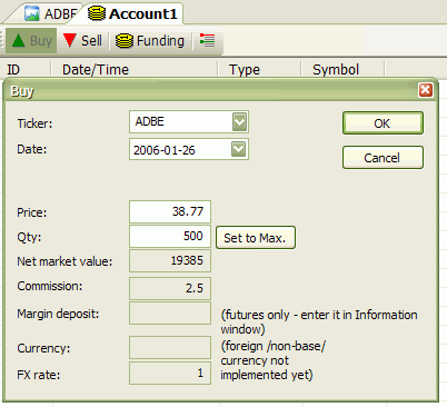 Then in the Buy dialog you need to select the symbol, the trade date/time. Once they are entered AmiBroker will display price of given symbol at the selected date/time (or preceding one if no exact match is found). It will also calculate maximum possible quantity taking price and available funds into account.