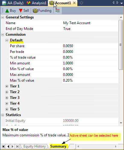 It is good idea to go to "Summary tab" and setup commissions and trading mode. If this account is used for End-of-day trading you should set "EOD Mode" to YES, otherwise (if you trade intraday) you should set "EOD Mode" to NO. Depending on this setting Buy/Sell dialogs will allowyou to enter date and time of the trade or only date.