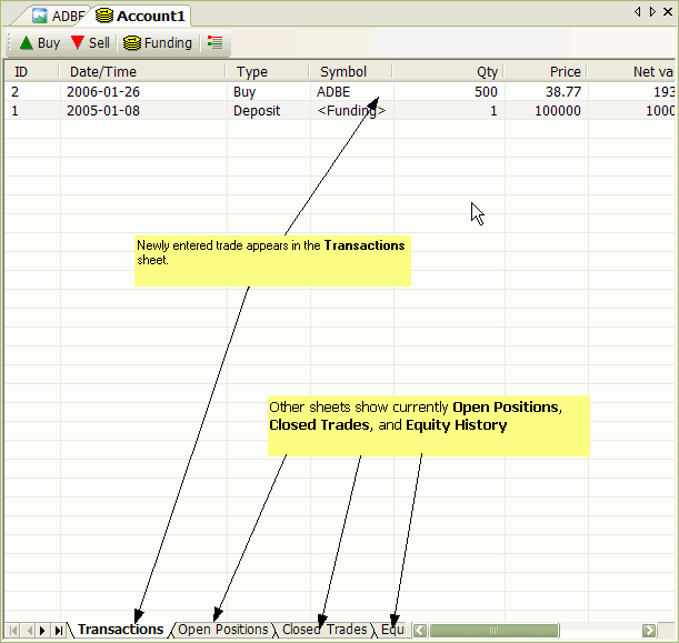 All transactions that you made are listed in the "Transactions" sheet. All open positions are listed in "Open Positions" sheet. If you enter the trade for symbol that has position already open, AMiBroker will adjust "open positions" accordingly (perform scaling in/out). Once open position is closed it is removed from "open positions" list and moved to "Closed trades" sheet.