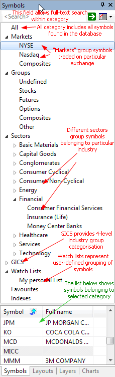 (usually) only once in the given tree leaf. Symbols window is divided into three parts: The search box allows to perform full text searches (including wildcard matching) against symbol and full name within selected category. So for example if you select "Technology" sector and type A* (letter 'A' and wildcard character *) the symbol list will show all symbols belonging to Technology sector with symbol or full name beginning with letter 'A'. Another example would be tping *-A0-FX - this will return all forex symbols on eSignal database (those ending with -A0-FX substring). The category tree (see the picture) shows different