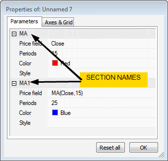 _SECTION_BEGIN/_SECTION_END markers allow AmiBroker to identify code parts and modify them later (for example remove individual sections). In addition to that sections provide the way to make sure that parameters having the same name in many code parts do not interfere each other. For example if you drop two moving averages the resulting code will look as follows:
