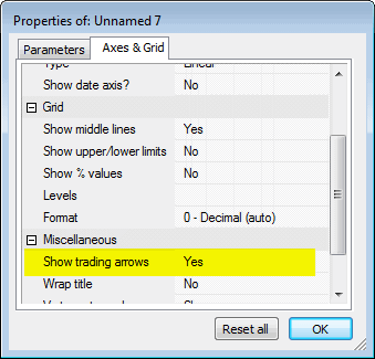 A. Trade arrows can be displayed on any chart pane (not only one built-in price chart). However, by default, the arrow display is turned OFF. To turn it ON you have to open Parameter dialog, switch to "Axes and grid" and switch "Show trading arrows" option to "Yes".