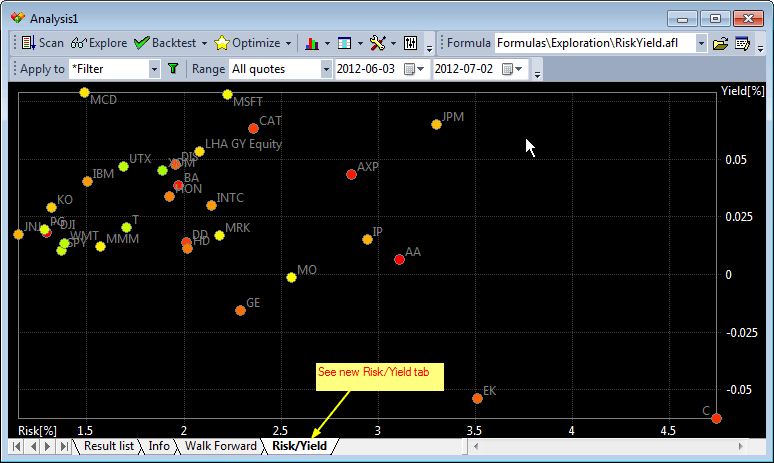 4. In the bottom row of tabs you will see new "Risk/Yield" tab, click on it and you will see XY chart generated during exploration: