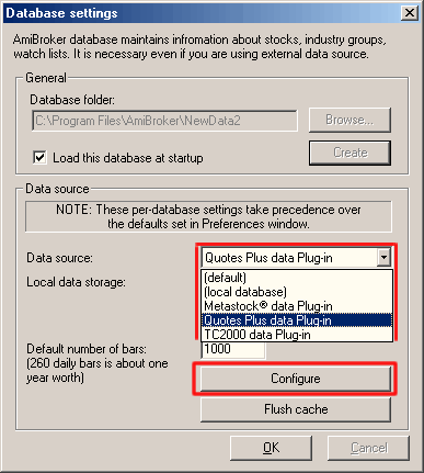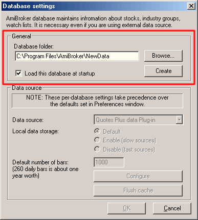 One of the new features introduced in AmiBroker version 3.90 is the ability to read directly external databases. This is achieved by means of data plug-in DLLs that allow to link AmiBroker database with an external source. Please note that althrough you will be using external database, you will still need an AmiBroker database for storing additional information that is not supported by the external source like hand-drawn studies, assignments to groups, watch lists, composites and so on. You can find more information on AmiBroker database handling here.