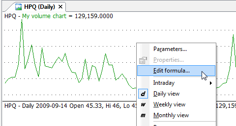 Now you can improve your indicator by adding Param functions so both color and style of the plot can be modified using Parameters dialog. To do so, click with RIGHT mouse button over chart pane and select Edit Formula (or press Ctrl+E)