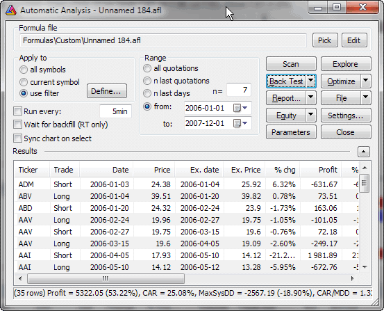 buy/sell rules. AmiBroker can produce report telling you if buy/sell signals