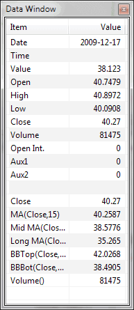 Data window can be displayed using Window->Data Window menu The Data Window shows the date/time and values of open, high, low, close, volume, open interest, aux1 and aux2 of the bar under the mouse cursor. It also shows mouse cursor Y-coordinate ("Value") expressed in terms of price corresponding to current mouse cursor location. The Data Window also shows the values of all indicators defined in the formula. These values are automatically updated when cursor stops moving for a fraction of a second.