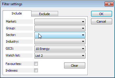 Filtering option gives you ability to narrow your search to symbols belonging to the specified market, group, sector and industry. You can also mark to include only favourites or indexes. You can use include and/or exclude type filter so you can also selectively exclude some kind of symbols .