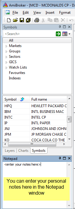 saved / read back as you browse through symbols. Notes are global and