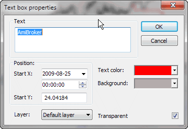 In the text box properites window you can change the text displayed in the box, select start co-ordinates as well as text and background colours and transparent style.