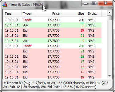 Time & Sales window that provides information about every bid, ask and trade streaming from the market. Each row displayed represents either new trade, new bid or new ask that is sent by the streaming data source.